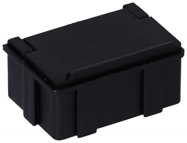 Preview: The image shows a small, black plastic box with a rectangular shape. It has a slightly raised flap and vertical ridges on the sides for better grip.
