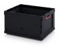 The picture shows a black plastic box with an open lid. The sides have a diamond-shaped pattern, and one side has a red handle. It is sturdy and easily stackable.