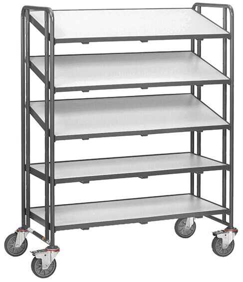 The image shows a sturdy, five-tiered cart with a metallic frame. The shelves are flat and made from a smooth material, suitable for placing various objects. The cart has wheels.
