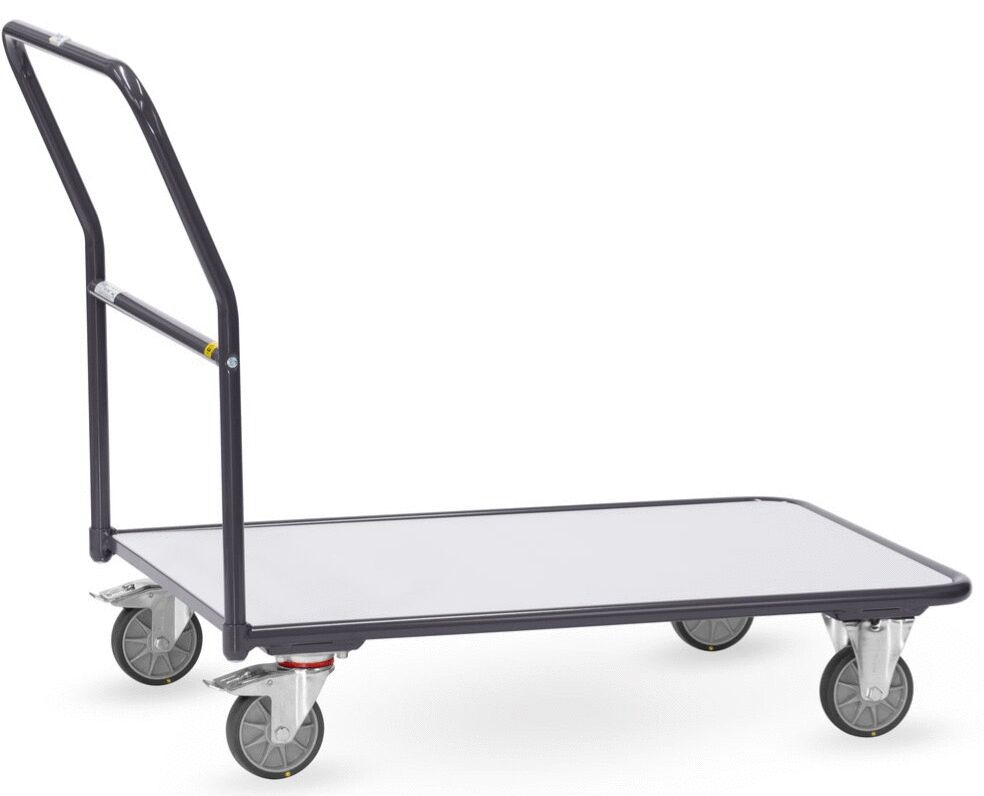 The image shows a flat transport cart with a rectangular platform design and a sturdy handle. It has four wheels that allow for easy movement.