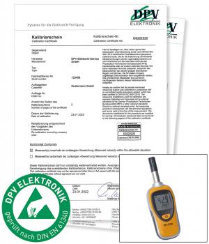 The image shows a calibration certificate in document form and an orange measuring device with a digital display. At the bottom left, there is a green logo with the text "DPV ELEKTRONIK".