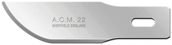 The image displays a shiny, narrow blade with a curved, sharp edge. The words "A.C.M. 22" and "SHEFFIELD ENGLAND" are inscribed on the blade. There is a hole on one side for the handle.