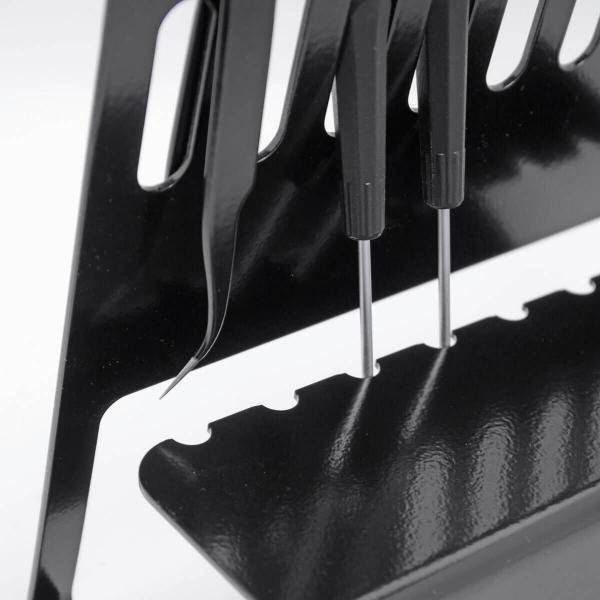 Preview: The image shows a black holder with various tools. Three long, thin tools protrude, with differently shaped tips. The background is light.
