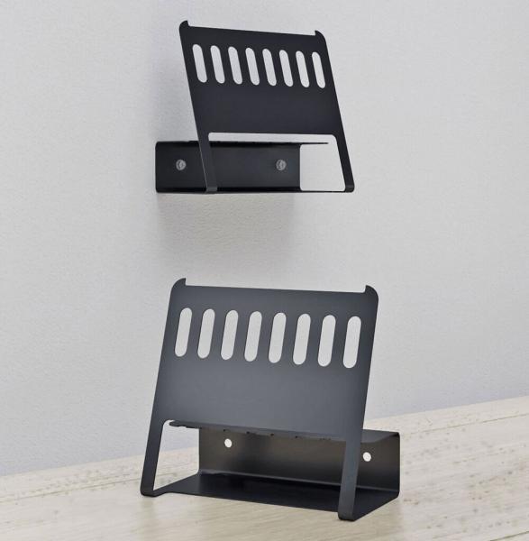 This is a black, metal holder with vertical slots. It has a stable base and is used for storing devices or tools. The slots on top allow for air circulation.