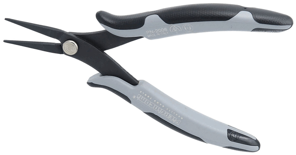 Piergiacomi ESD needle nose pliers are the ideal choice for precise and safe gripping in ESD areas (EPA). Made in Italy from high-quality carbon steel and with an anti-reflective phosphate coating, they offer a clear view of the workpiece. The ergonomic dolphin handle made of dissipative material ensures a secure grip, even during prolonged use. The integrated return spring reduces the force required and increases efficiency.