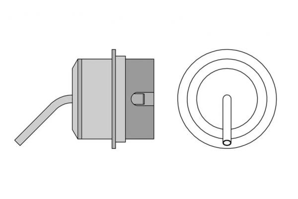 The image shows a schematic connection with a round casing and a hose leading out to the side. Side view and top view are depicted.