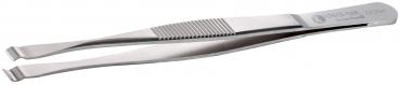 The image shows a silver stainless steel tweezer. It has a narrow, long shape with slightly curved ends and a serrated surface for better grip.