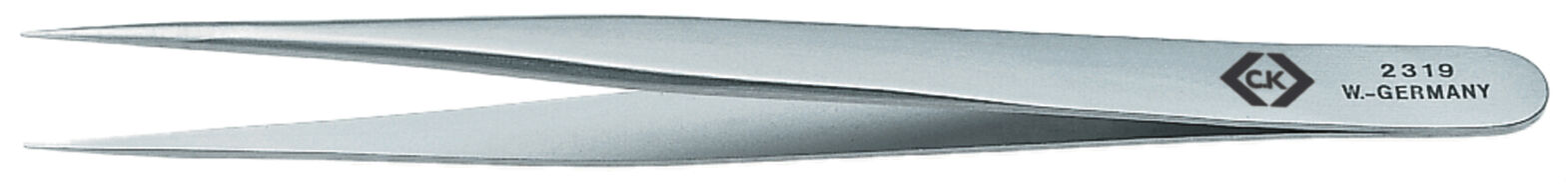 The image shows a shiny, slender metal tweezer. It has two tapering ends that open and close easily, and an engraving that reads "W-GERY".