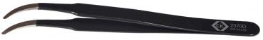 The image shows a black tweezer with slightly curved tips. It has a matte finish and a precise, fine construction, ideal for gripping small objects.