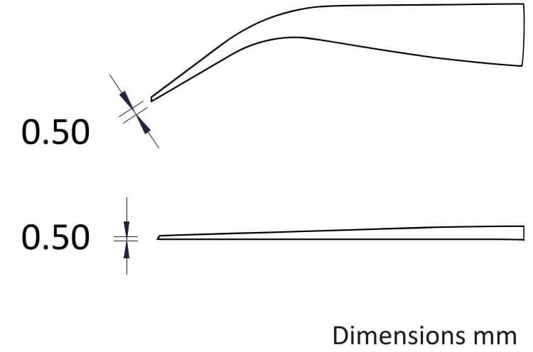 The image displays technical drawings featuring two lines with dimensions. The top line is curved, the bottom line is straight, both with a thickness of 0.50 mm. On the right, it reads "Dimensions mm".