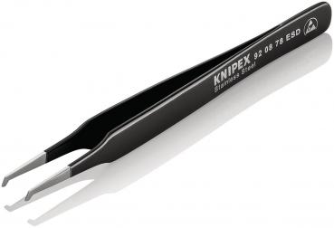 The image shows a black stainless steel tweezer with slim, curved tips. It features the imprint "KNIPEX" and an item number. The surface is smooth and shiny.