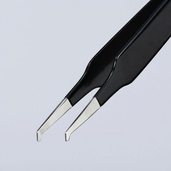 Preview: The image shows a black stainless steel tweezer with slim, curved tips. It features the imprint "KNIPEX" and an item number. The surface is smooth and shiny.