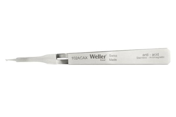 The image shows a sharp, narrow metal tweezer with a shiny surface. On the side, the inscription "Weller" and the model number "102ACAX" are visible.