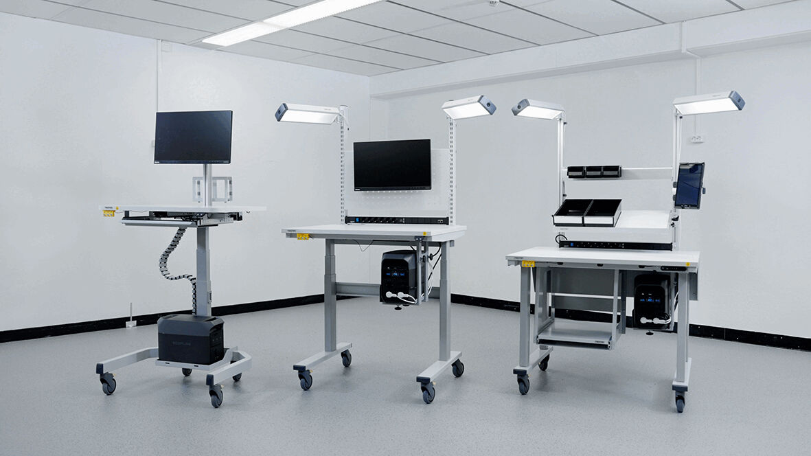 Ein robuster, stabiler Arbeitstisch auf Rollen, speziell konzipiert für präzise Tätigkeiten wie beispielsweise die Elektronikmontage.