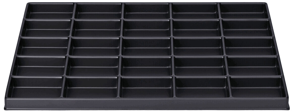 Das Bild zeigt ein rechteckiges, schwarzes Tablett mit 24 gleichmäßig angeordneten Vertiefungen, die in einem 6x4-Raster angeordnet sind. Die Vertiefungen sind rechteckig und gleich groß.