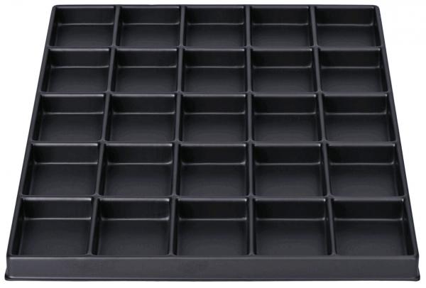 Preview: Das Bild zeigt ein schwarzes Tablett mit 24 gleichmäßig verteilten, rechteckigen Fächern. Es hat einen flachen Rand und ist aus Kunststoff gefertigt.