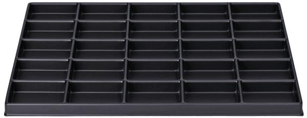 Preview: Das Bild zeigt ein rechteckiges, schwarzes Tablett mit 24 gleichmäßig angeordneten Vertiefungen, die in einem 6x4-Raster angeordnet sind. Die Vertiefungen sind rechteckig und gleich groß.