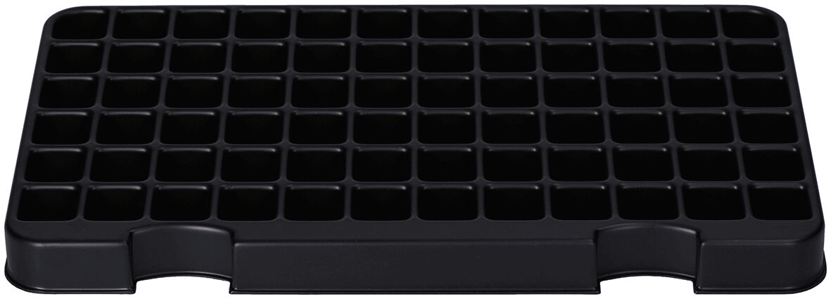 Preview: Das Bild zeigt ein rechteckiges, schwarzes Tablett mit vielen kleinen, quadratischen Vertiefungen. Es gibt 84 Fächer, die gleichmäßig angeordnet sind. Einige Ecken sind abgerundet.