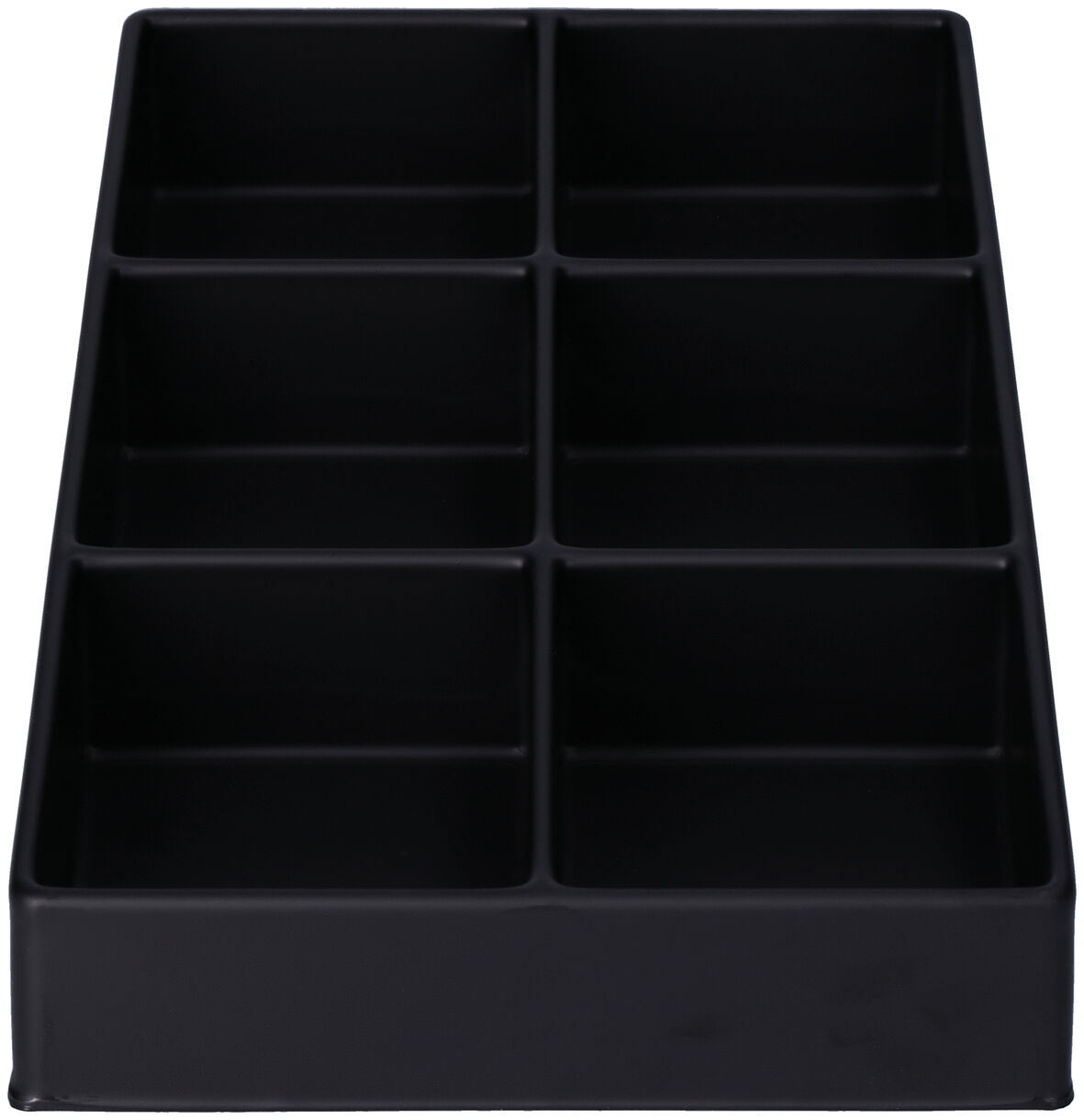 Das Bild zeigt ein rechteckiges, schwarzes Tablett, unterteilt in sechs gleich große Fächer. Die Oberfläche ist glatt und unbeschichtet. Es ist einfach und funktional gestaltet.