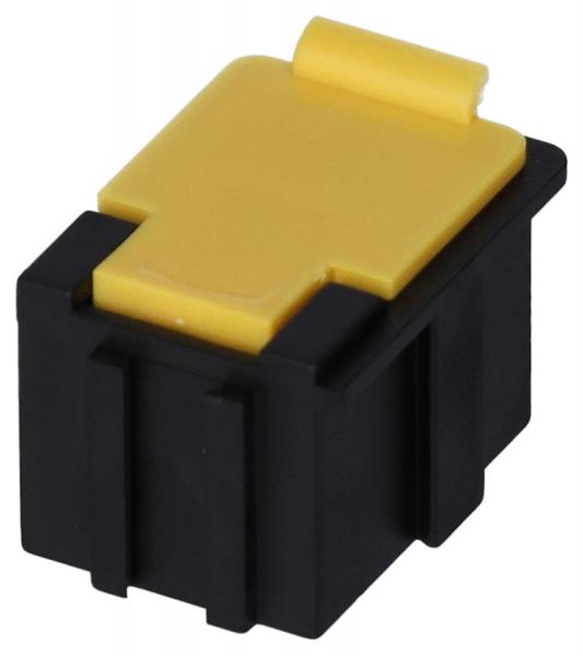Preview: Das Bild zeigt einen kleinen elektrischen Stecker, der hauptsächlich schwarz ist und eine gelbe Oberseite hat. Die Form ist rechteckig mit einer flachen Abdeckung und einer Aussparung für das Einstecken.