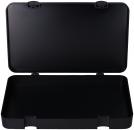 Das Bild zeigt einen kleinen, rechteckigen Kasten in Schwarz. Er hat eine glatte Oberseite mit zwei seitlichen Halterungen. Der Kasten wirkt stabil und kompakt.