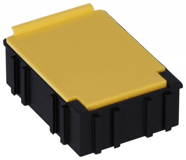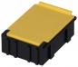 Preview: Das Bild zeigt eine kleine, rechteckige Box. Der Körper ist schwarz und hat eine gelbe, flache Oberseite. Die Ecken sind abgerundet, und es gibt seitliche Vertiefungen. Die Box wirkt stabil und praktisch.