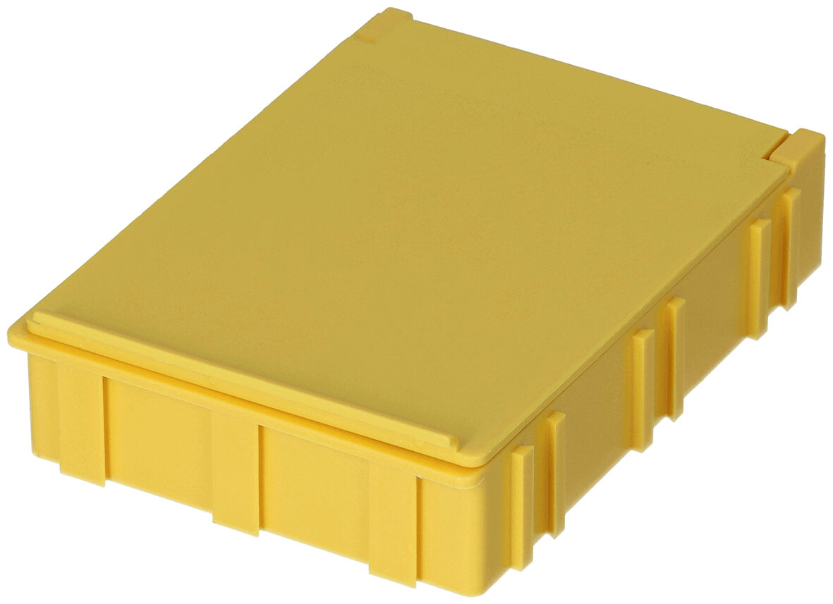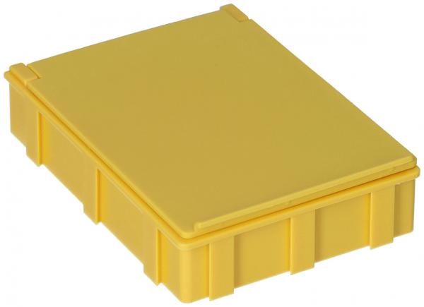 Das Bild zeigt eine gelbe Kunststoffbox mit einem flachen, abnehmbaren Deckel. Sie hat abgerundete Ecken und ein strukturiertes Außendesign mit kleinen Vertiefungen.