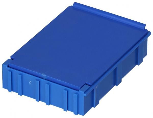 Preview: Das Bild zeigt eine rechteckige, blaue Kunststoffbox mit einem Deckel. Die Box hat eine glatte Oberfläche und rillenartige Strukturen an den Seiten. Sie wirkt stabil und hat abgerundete Ecken.