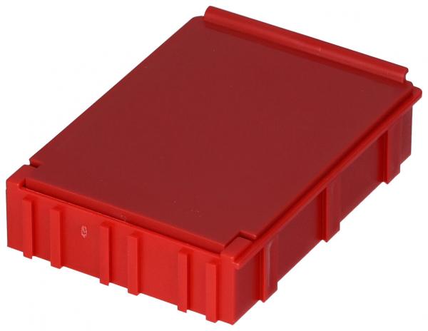 Auf dem Bild ist eine rote, rechteckige Box zu sehen. Sie hat einen flachen Deckel und ist aus Kunststoff. Die Oberfläche ist glatt, die Kanten sind leicht abgeflacht. Die Box hat seitliche Vertiefungen für besseren Halt.