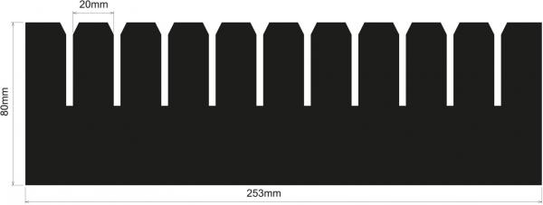 Das Bild zeigt eine schwarze, rechteckige Struktur mit einer gezackten Oberkante. Sie hat eine Höhe von 80 mm und eine Breite von 253 mm. Zwischen den Zacken ist ein Abstand von 20 mm.