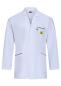 Preview: Das Bild zeigt einen weißen, langen Kittel mit einem Kragen. Er hat lange Ärmel, zwei seitliche Taschen und eine Brusttasche. Auf der linken Brustseite befindet sich ein gelbes Logo.