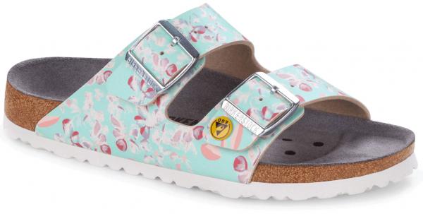 Die Pantolette Arizona Birko-Flor von Birkenstock ist speziell für den Einsatz in EPA-Zonen konzipiert, um optimalen Schutz gegen statische Entladungen zu bieten – entsprechend der ESD-Norm DIN EN 61340-5-1. Diese Schuhe sind aus Birko-Flor gefertigt, einem hochwertigen, synthetischen Material aus Europa, das hautfreundlich, reißfest und pflegeleicht ist und für seine Langlebigkeit bekannt ist. Das Design mit einem ansprechenden Motivprint und die schmale Standardweite bieten eine attraktive Optik sowie eine passgenaue Form. Das markentypische Fußbett von Birkenstock, das sich der Fußsohle anpasst, unterstützt den Fuß ergonomisch und sorgt auch bei langen Tragezeiten für hohen Komfort. Die Laufsohle aus EVA zeichnet sich durch hohe Rutsch- und Abriebfestigkeit aus und trägt zu einer guten Dämpfung bei. Mit einem geringen Gewicht und der praktischen Zweischnallen-Form ist diese Pantolette leicht und komfortabel.