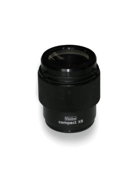Das Bild zeigt ein schwarzes, zylindrisches Objektiv mit einer gläsernen Linse oben. Es hat eine matte Oberfläche und trägt die Aufschrift "compact X8" an der Seite. Gesamte Form ist kompakt.