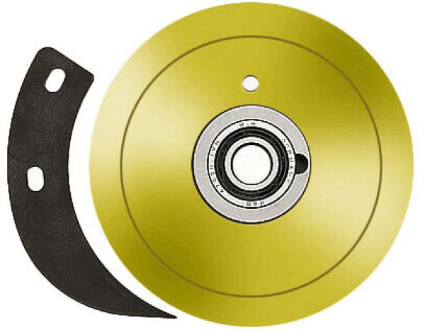 Das Bild zeigt eine runde, goldene Scheibe mit mehreren konzentrischen Linien und einer zentralen Öffnung. Neben der Scheibe liegt ein schwarzes, gebogenes Teil.