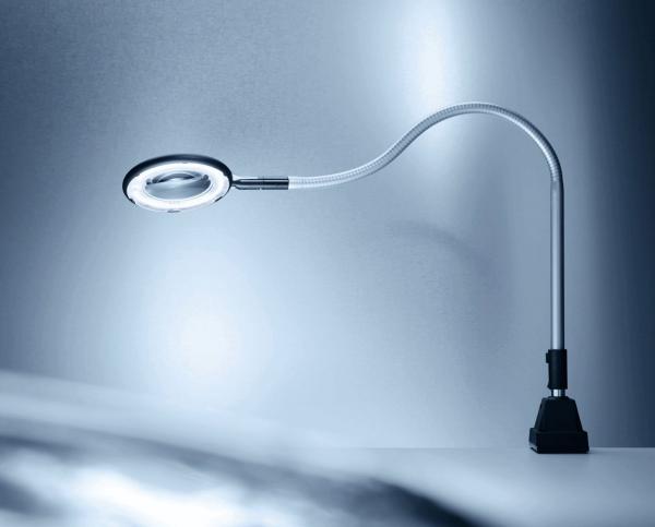Preview: Das Bild zeigt eine große Lupe mit einem runden, beleuchteten Rahmen. Sie hat einen langen, flexiblen Hals und steht im Weichlicht. Der Hintergrund ist hell und einfarbig.