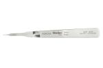 Das Bild zeigt eine schwarze Werkzeugkoffer mit dem Weller-Logo. Daneben liegen vier feine, metallische Pinzetten. Der Koffer hat einen Griff und Scharniere.
