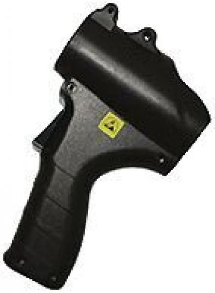 Das Bild zeigt ein schwarzes, handgehaltenes Gerät mit einem abgerundeten Kopf und einem Griff. An der Seite befindet sich ein gelbes Symbol. Es erinnert an ein Werkzeug oder ein Messgerät.