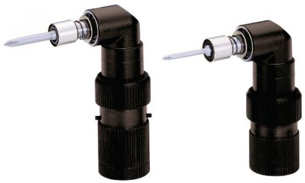 Das Bild zeigt einen schwarzen, kompakten Adapter mit einem abgewinkelten Ende. Oben ist ein silberner Teil sichtbar, der einen langen, dünnen Stift hält. Der Adapter hat eine strukturierte Oberfläche.