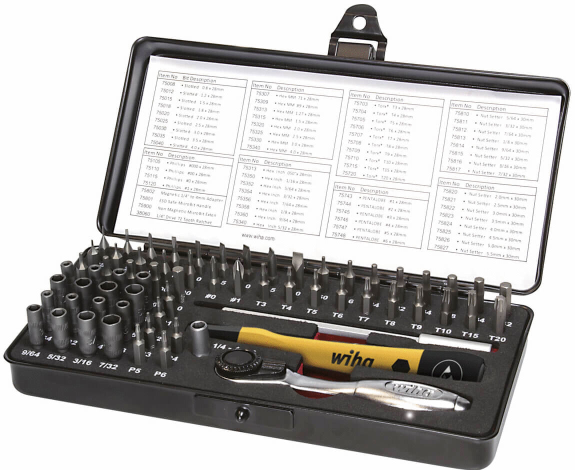 Das 65-teilige MicroBit-Set von Wiha ist speziell für den Einsatz in Bereichen der Elektronik und Feinmechanik konzipiert, wo Präzision und Schutz kleiner Schraubverbindungen essentiell sind. Das Set beinhaltet eine Vielzahl von Bits in gängigen Profilgrößen für diverse feine Schraubarbeiten, sicher aufbewahrt in einer robusten, kompakten Box. Der enthaltene ESD Feinschraub-Griff entspricht der internationalen Norm IEC 61340-5-1 und bietet durch seinen Oberflächenwiderstand von 10^6 - 10^9 Ohm einen effektiven Schutz gegen elektrostatische Entladungen. Zusätzlich ermöglicht die mitgelieferte Bit-Ratsche mit einem Schaltwinkel von nur 5° kraftvolles, jedoch präzises Arbeiten auch in beengten Räumen. Das Set umfasst diverse Bit-Größen und Typen, darunter Philips, Schlitz, Sechskant, TORX® und Pentalobe, sowie passende Steckschlüssel und Adapter, die eine breite Anwendungspalette abdecken.