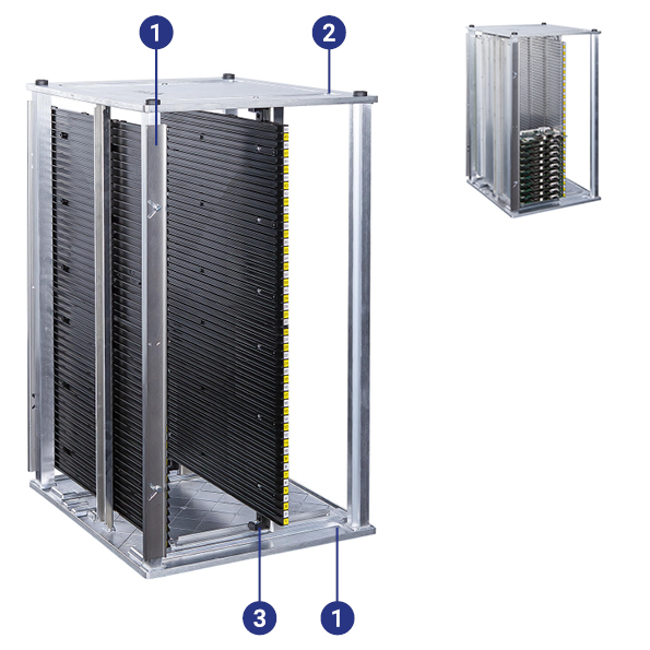 Leiterplattenmagazine mit geringer Höhe, z. B. für den Einsatz in Temperöfen. Eine Reduzierung der Höhe verhindert auch die Gewichtsüberladung bei schweren Leiterplatten oder dem Einsatz von Warenträgern.