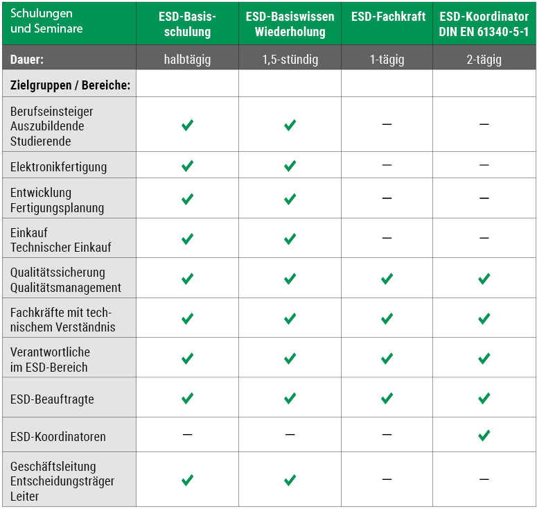 Ein nach der Norm DIN EN IEC 61340-5-1 aufgebautes ESD-Kontrollprogramm erfordert die Bestellung eines ESD-Koordinators, der mit der Verantwortung ausgestattet ist, die Anforderungen der Norm umzusetzen. Dazu bieten wir regelmäßig Seminare für ESD-Koordinatoren an.