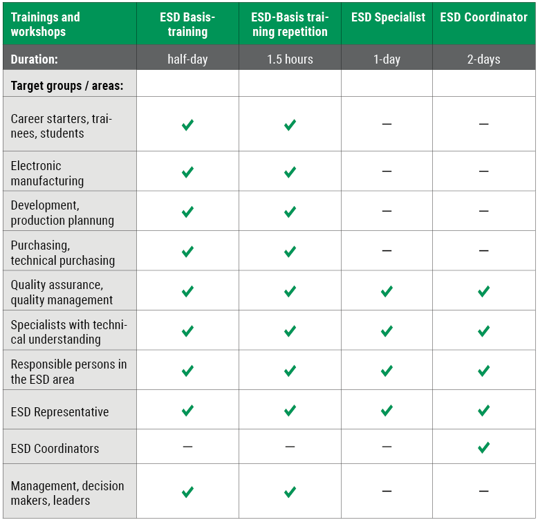 An ESD control program set up in accordance with the DIN EN IEC 61340-5-1 standard requires the appointment of an ESD coordinator who is responsible for implementing the requirements of the standard. We offer regular seminars for ESD coordinators.